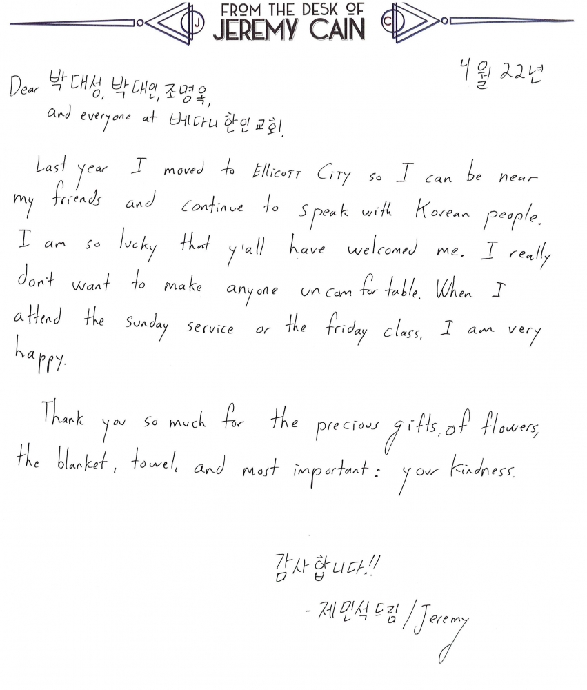 지난 2월 우리교회는 특별한 분을 새가족으로 맞이하는 시간을 가졌습니다. 한국 사람을 사랑하고, 한국 문화와 말을 사랑하는 미국 청년입니다. 제민석이라는 한국이름도 가지고 있는 맑고 순수한 청년 제레미입니다. 주일 1부 예배에 갑자기 나타나 예배에 참여하기 시작하더니 이제는 한국학교 학생으로 한글도 열심히 배우고 있습니다. 한국에서 잠시 영어교사로 일을 했기에 한국말로 어느 정도 의사소통은 가능합니다. 몇 주전 피트니스 센터에서 우연히 만났는데 한글이 쓰여있는 옷을 입고 운동을 하고 있어 놀라기도 했습니다. 제민석 형제가 어제 교회로 손편지를 보내왔습니다. 여러 고마운 마음이 담겨있는 내용이었고 한편으로는 자신 때문에 성도님들이 불편해 하지는 않는지 걱정하는 내용도 있었습니다. 이미 말씀드렸지만, 쉬운 한국말은 어느정도 할 수 있으니, 영어 걱정마시고 말도 걸어주시고 많은 관심을 표현해 주시기를 부탁드립니다.