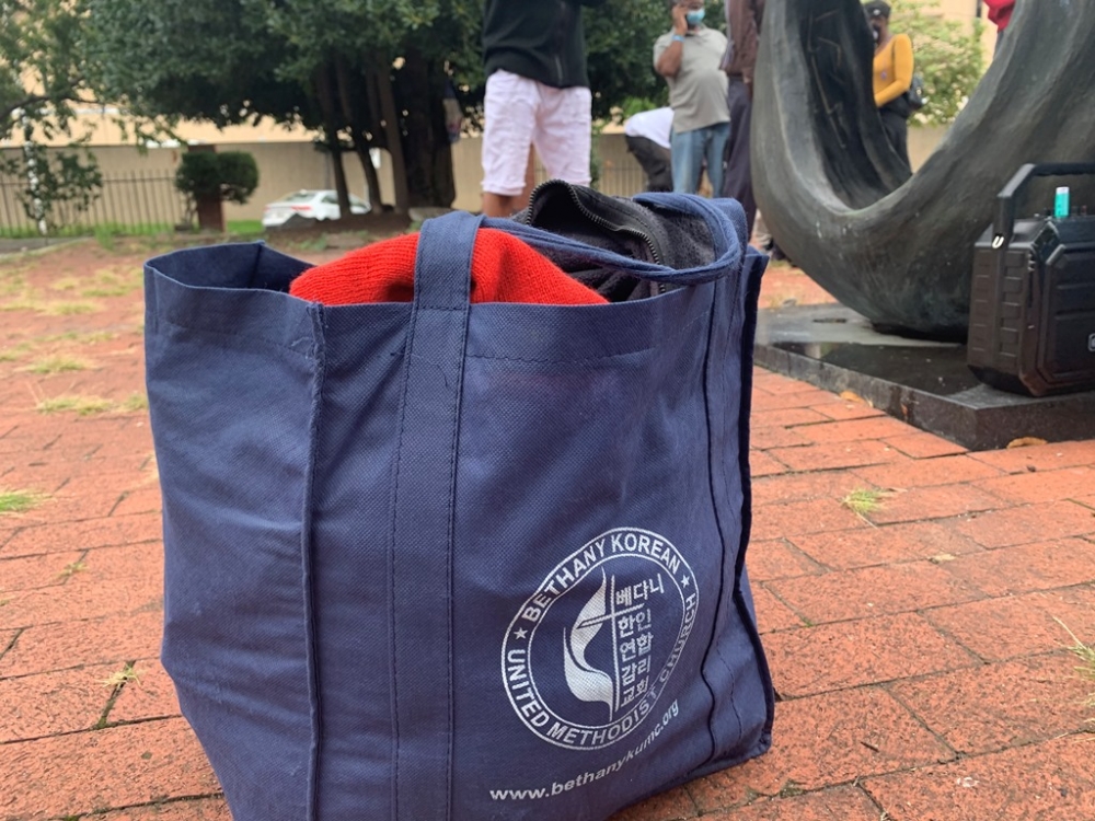 그러던 중 한 성도님의 섬김으로 작년 가을부터 교회 이름이 들어간 시장가방을 나눠드리기 시작했습니다. 튼튼하고 많은 물건이 들어갈 수 있는 넉넉한 크기의 가방입니다. 매주 노숙자분들도 좋아하시고, 드리는 입장에서도 기분이 좋습니다.