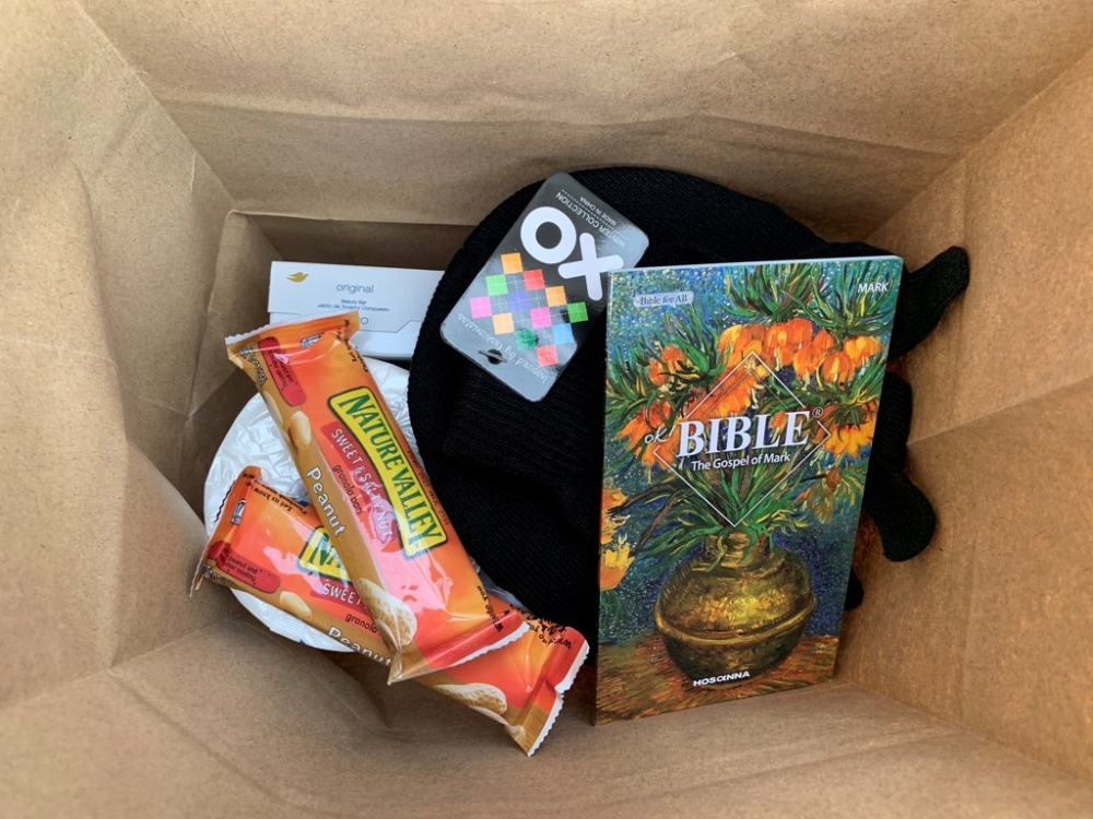 성도님들이 직접 만드신 식사와 모자, 장갑, 성경책, 비누, 휴지 등이 담긴 가방을 전달했습니다.