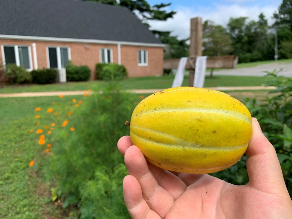 교회 정문 앞 십자가 정원에 노란 참외를 처음으로 수확했습니다.
