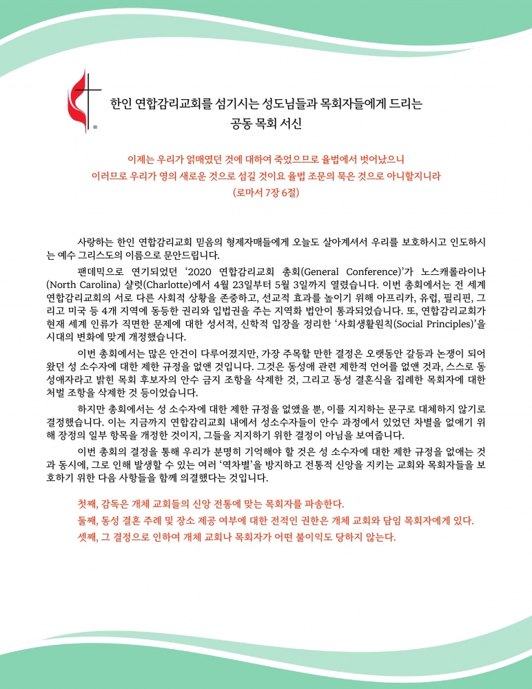 연합감리교회 한인공동체에 드리는 공동 목회서신(총회 이후)